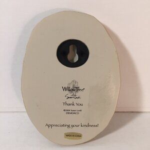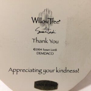 This is a Thank You plaque by Willow Tree in 2004. It has the hook inset in the back to be hung up. It is 4 inches in length. On the back it says "Appreciating your kindness!"