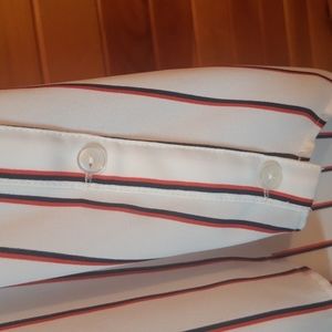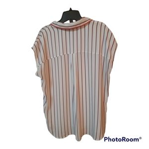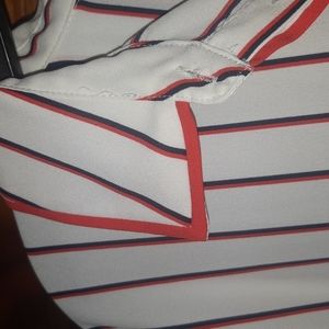 100% polyester sleeveless top is a crisp white with red and navy stripes. Buttons on bottom of sides, hi-lo style, cute collar. 25" shoulder to hem front, 28" shoulder to hem back and 23" armpit to armpit approximately.