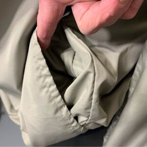 In very good condition. Great lightweight 90's active wear windbreaker sweater. Nice neutral champagne tan color. Contrasting jersey knit collar, wrists and waist hems *(tiny peeling). V neck line and side pocket. Fine lining. Embroidered logo on the chest. Please see pictures