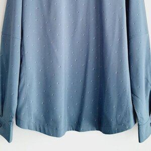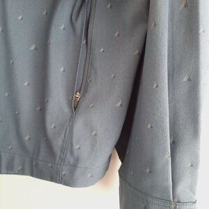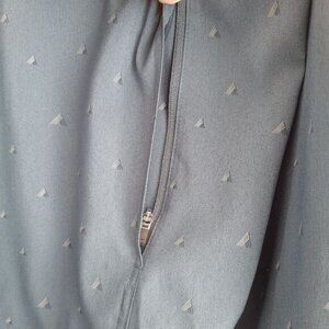 • Long sleeve button down top in blue with subtle geometric pattern with chest utility pockets and lower concealed zip pockets.