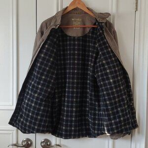Plaid soft fleece lining at interior back and quilted material at interior sleeves.