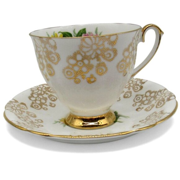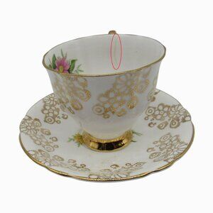 WINDSOR Tea Cup And Saucer With Floral And Gold Lace Pattern England Vintage