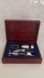 Winemate wine accessories in a wooden box. Lid lifts and has a magnetic closure. Accessories include foil cutter, cap and wine bottle opener in silver tone metal.