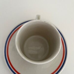 Demitasse cup and saucer is marked Winterling, Marktleuthen, Bavaria on the bottom of the cup and saucer. The cup is a small demitasse size, perhaps for espresso or Turkish coffee. The cup depicts the coat of arms for Friesland , which is an area in the Netherlands. The colours are red, blue and yellow. The handle of the cup is an angled shape. The saucer has a red ring and a blue ring around the exterior. Both cup and saucer are a beige colour.