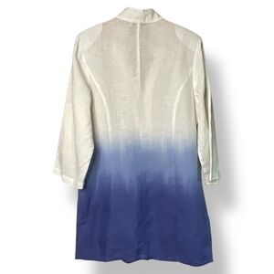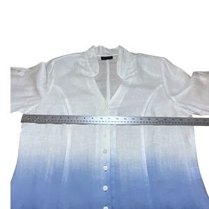 Euro size 42 = US size 12. In very good pre owned condition showing no signs of wear or wash wear. Partial mandarin collar ending in a split Vee neckline. Hombre colouring from pure white down to purple blue. Photos are important so please check all for condition, detail and measurements.