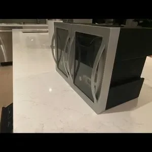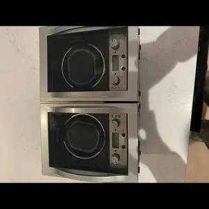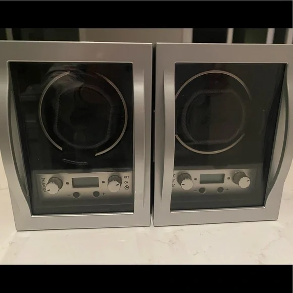 This compact, stackable Wolf watch winder is made of black carbon fiber, glass, and aerospace-grade aluminum. It features a backlit LCD display, a locking cuff that accomodates bracelets larger than 10" long, and the ability to interlock with other winders to create a multiple winder system. It runs off an included 5V power adapter. Rotation options include customizable settings, from 300-1200 rotations, clockwise, counterclockwise, and bidirectional turning, and different increments of delay, for 57 different programming options.