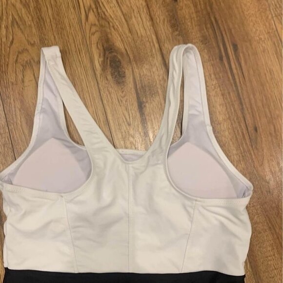 Woman’s one piece swimsuit. Black and white. Racerback. White portion is lined. Size large. Colour blocking in the right spots!