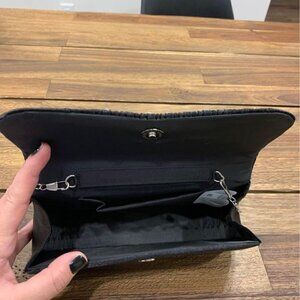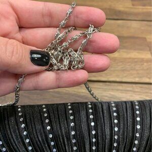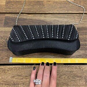 Woman’s rhinestone black satin clutch purse. Chain strap. Holds a lot. See pics for dimensions.