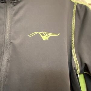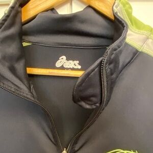 Navy, white, and green ladies athletic jacket. In nice used condition. Some minor puckering along the zipper as shown in the photos.