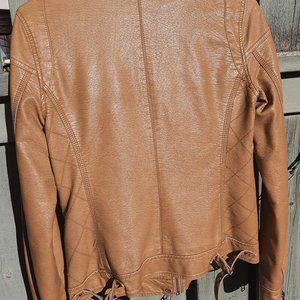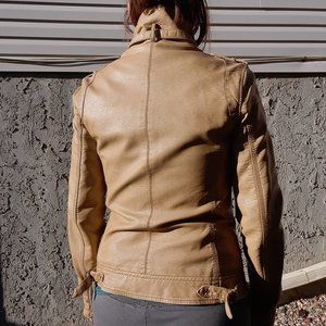 Distressed, stretchy, faux leather moto jacket, light taupe/gold colour size XS/S. In very good condition, no rips or tears. Very soft feeling faux leather, high collar, gold snap details.