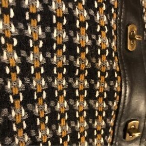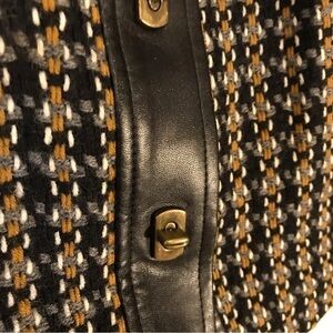 Sweet wool/ plaid/ tweed skirt with faux leather details. Cool button front. Excellent pre-loved condition.