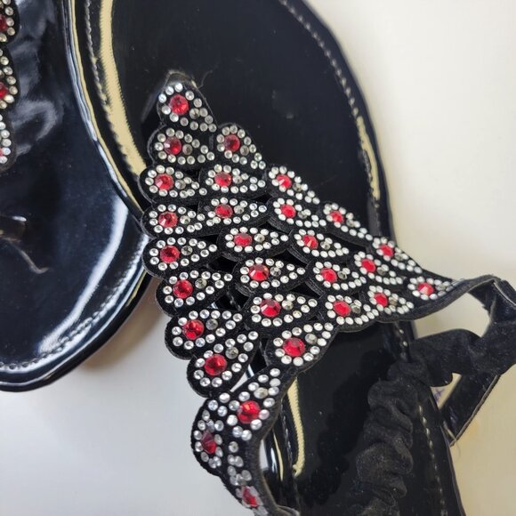 WOMENS Size 7 Black Glitter Sandals Silver Red Crystal Peacock Motif Shoes New