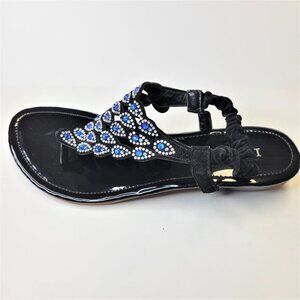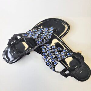 WOMENS Size 9 Blue Silver Black Sandals Peacock Motif Slippers Flats Shoes - NEW