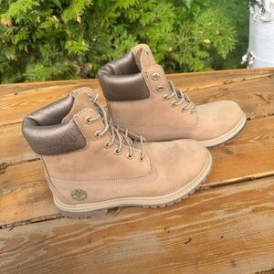 WOMEN'S TIMBERLAND UNIQUE WATERPROOF BOOTS. NATURAL WITH BRONZE LOGO AND PADDING