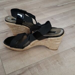 Beautiful black in color and the straps are elastic style. Heels are a wedge and size 7.5 Pre-owned and are still in great shape Offers are welcome!