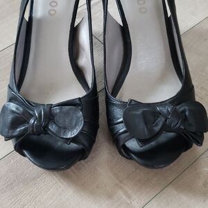 Beautiful black leather uppers with open toe with a bow. Slinback style with a 2.5 inch heel. Size 8 Pre-owned and are in excellent condition