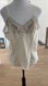 Wondermaid cream colour satin camisole with adjustable spaghetti straps and lace trim around the top at the front. The lace trim is cream and taupe colour. Sheer. 100% polyester. Made in U.S.A.