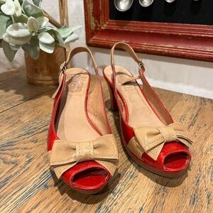 • Red patent leather slingback heels by Wonders. Size 38. 100% leather, made in Spain. Contrasting camel leather bow, cushioned insole, and stable heel for comfort and style. Like new – worn once or twice.
