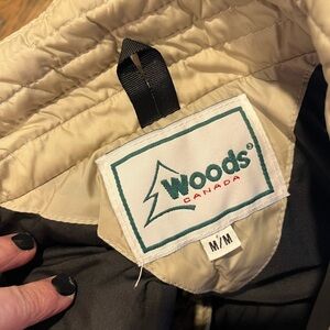 Veste matelassée classique beige de la marque Woods Canada, taille M/M. Fermeture éclair à l’avant, garnissage certifié en duvet de canard pour une chaleur optimale, légère et facile à superposer. Emmanchures bordées de noir et col montant pour bloquer le vent. Parfait pour les journées fraîches.
