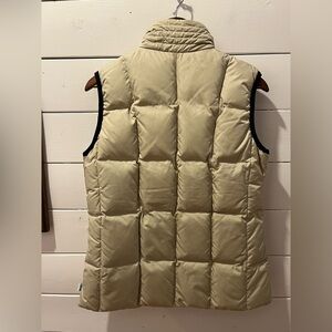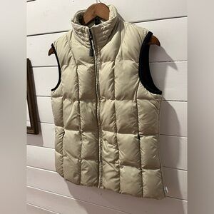 Classic and cozy beige puffer vest from Woods Canada, size M/M. Features a zip-front closure, lightweight construction, and certified duck down insulation for reliable warmth. Sleeveless design with black trim at the armholes and a high collar for added wind protection. Ideal for layering in chilly weather.