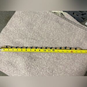 Dark blue beads measure approx 1/4” diameter, brown beads are smaller. Necklace measures approx 18” in length with a barrel clasp. As these are wooden beads, there is some variation in bead size, colour and markings. Beads are strung on a clear cord with no stretch.