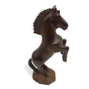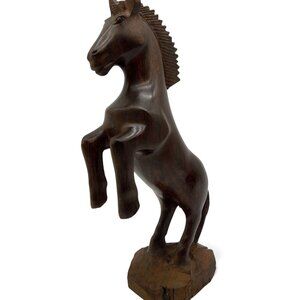This exquisite hand-carved wooden sculpture captures the majestic essence of a prancing horse, showcasing fine craftsmanship and attention to detail.