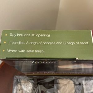 Enjoy some downtime with this dark wood serenity tray - comes with 4 candles and 3 bags each of pebbles and sand. Still in original packaging!