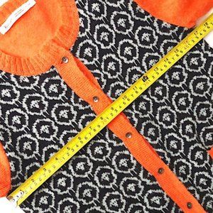 WOOLRICH Wool Mohair blend Women Cardigan in Orange, Black & White Sheep Motif at Front, Long Sleeves. Excellent Light quality, great for Fall, Winter, under a coat in cold weather.