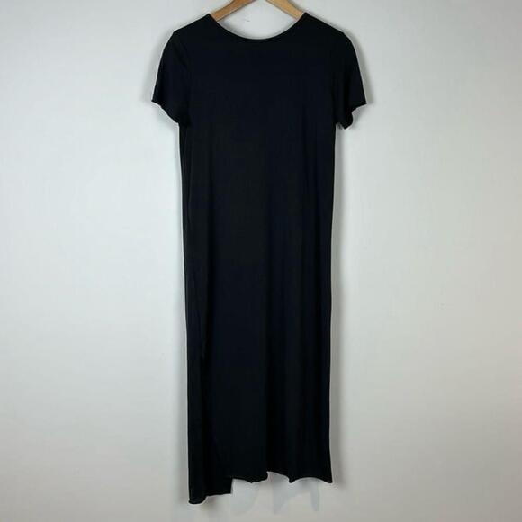 Black simple minimalist dress with a faux drape panel in the back and a small slit on the side.