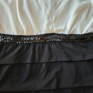 This was my wedding dress, Empire style, worn once and then stored away. The dress is quite new and in perfect condition as my wedding (second marriage) was recent. It is both elegant and comfortable: the fabric is polyester with some spandex, so the entire dress is stretchy, top and bottom. It is also fully lined, with decorative panels in the front of the black part, but not in the back. The dress measures 37.5" long. I am 5'2", so it is mid-knee length on me. It measures 17" across at the hips, and 14.5" across the sequined panel below the bust. I love to bundle and accept all reasonable offers.
