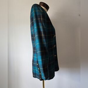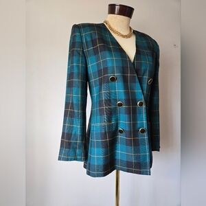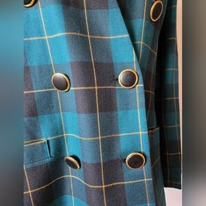 Tailored fit teal and black plaid long blazer. Double breasted design. Black and gold buttons. Lined in black