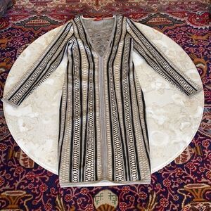 In excellent preowned condition fabulous WOW Couture Bodycon dress. Stunning design, with vertical lines, metallic fabric, super flattering with deep plunging neckline, long sleeves, knee length, this sexy dress is so stylish and elegant!