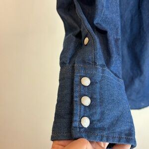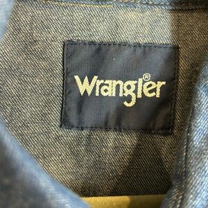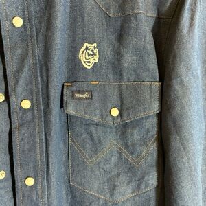 WRANGLER Sz L Western Style Snap Button Long Sleeve Snap Button Pockets Button Down Shirt. Embroidered with a tiger head (still there) and AGL (removed). Super soft. Raw hem with zig zag finish. Rodeo. Cowboy. Festival.