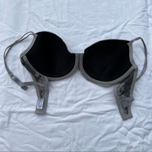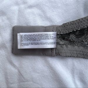 Wacoal Absolute Elegance lace contour bra. Beauty and comfort converge in this elegant bra. Lace-covered demi cups are lightly lined for subtle shaping. Underwire. Unique split straps that are adjustable in back. Dark grey cups with art deco silver lace overlay. Constructed of seamless microfiber with stretch lace wings. In EUC, no real flaws. Size 38D.