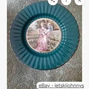 Elegant teal decorative plate featuring a romantic scene. Perfect for display.