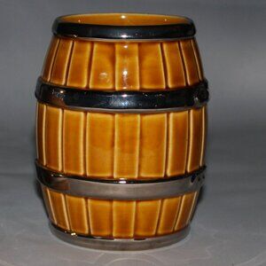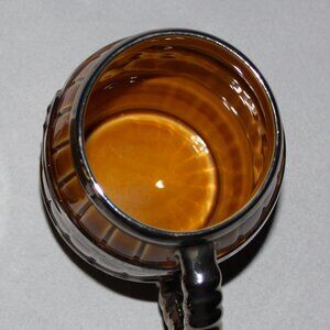 Barrel/Cask stein features 4 chrome hoops, 2 central and one each around rim and base. Chrome handle is ridged for a sturdier grip. Also in very good condition without chips, cracks, or crazing, but there is one very small area on a hoop with some minor flaking. Capacity is 16 ounces or 500 ml. Height is 4 3/4", width to handle is 5" and diameter of opening is 3".