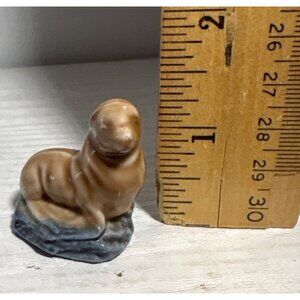 This hand-crafted Wade England ceramic miniature features a brown seal resting on a textured blue base. A timeless collectible with intricate detailing.