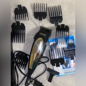 Wahl hair clipper kit featuring a sleek black and silver design. Includes multiple comb attachments for versatile styling.