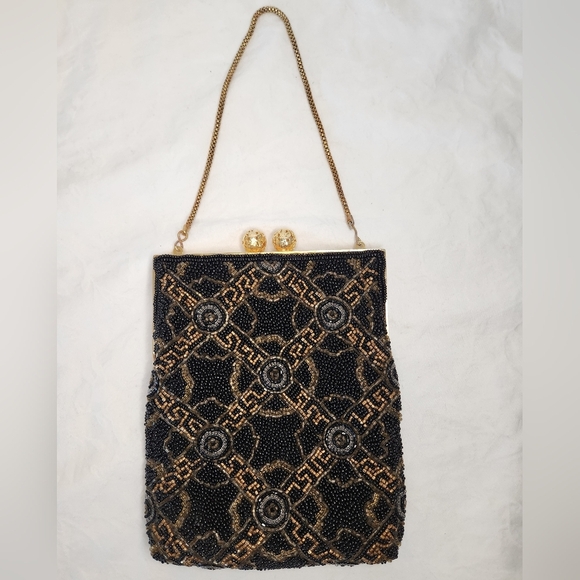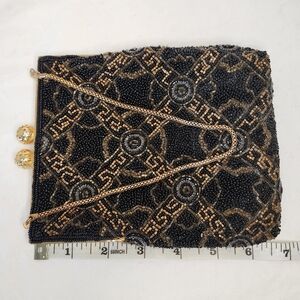 Hand Sewn Black Bronze & Gold Gary Art Deco Patterned Glass Seed Bead Clutch Evening Purse Handbag with Black Satin Lining and Ornate Ball Kiss Closure, by WALBORG.