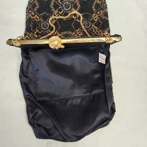 Vintage 40s, Made in Hong Kong, Gold Frame, Single inside pocket, Short Chain Handle can be tucked inside frame, I believe there was an inner foam lining that has disintegrated, it adds a bit of weight and shape to the bottom of the purse and does not affect wear, otherwise Excellent Vintage Condition.