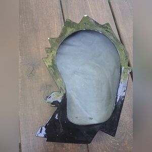 This fun new wave design was inspired by Lindsey B. Balkweill. A sculpture who’s work became very prominent during the 1980s. She is best known for her sculpted mennquin bust with defining angles that rang of 80s edginess. This piece has been glazed in shiny black and is formed to make it possible to hang on a hanger.