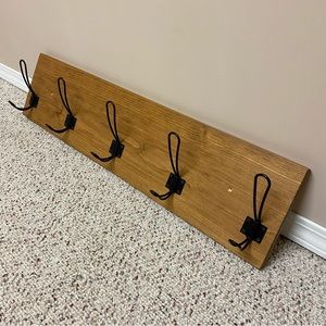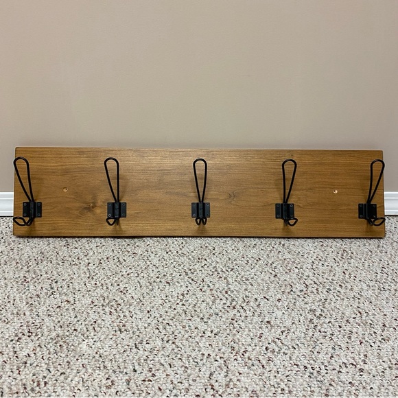 Farmhouse rustic wall-mounted coat rack with all hardware included. Made of solid wood and metal. Purchased from Etsy by a Canadian maker.