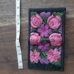 pink and purple embroideres floral wallet with black velvet background