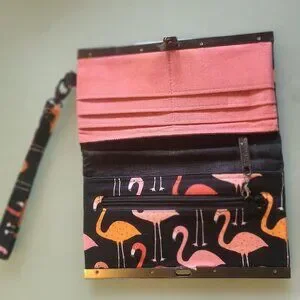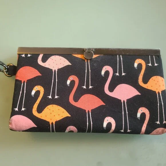 Cloth wallet - flamingo print. Light wear; closure does not have marks and works fine. Measures 4.5 inches by 7.5 inches.