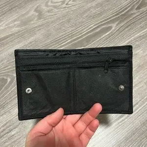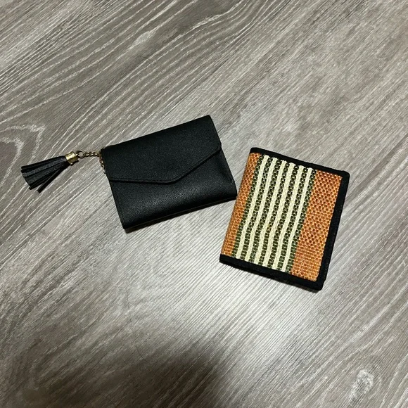 Pleather tri fold folding wallet and a grass texture woven fold wallet. Perfect for fitting in your pocket! Both included in purchase.