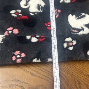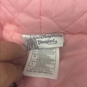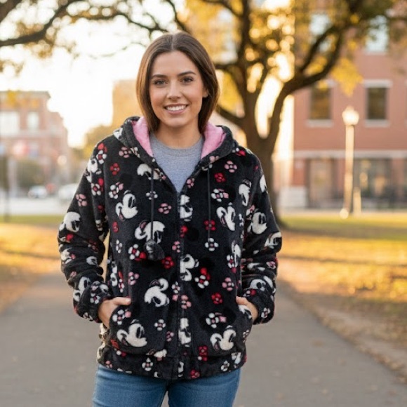 Cozy and lined , faux fur jacket featuring Minnie Mouse from Walt Disney World Disneyland Resort in size LRG . Has quilted pink lining , dark grey / almost black fleece with Minnie and flowers in red and pink . Hooded with wide elastic band at cuffs and waist and zipper down the front . Pockets on each side. No pilling , discolouration or matting of fleece. . Fabric is 100 % polyester , lining in 100% nylon with filling in polyester .