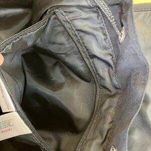 Walt Disney World backpack has embroidered logo on the front. Lettering for "Disney" has character motifs/designs. Adjustable padded straps, top flap with hook & loop closure, drawstring with toggle keeps the top secure. Large main compartment with small inner zippered pocket. Approx. 16" tall x 12" wide x 5 1/2" deep. Pre-owned condition: top drawstring is "fuzzy" from rubbing on hook & loop closure. Black nylon fabric has a few small scuff marks.