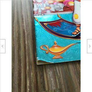 Walt Disney's World on Ice event program for Aladdin. Oversize book has full color photos of the ice skating performance with written storyline. Book has an ad for Barnum & Bailey circus at the back. Pre-owned book from 1993 has heavy creasing to cover, and a tear to the cover at the bottom spine corner. Large 11"x14" size.