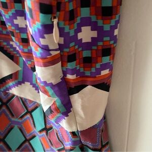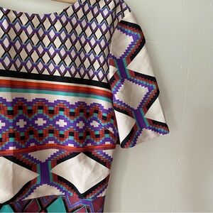 This lovely geometric patterned top by Walter Baker has a peplum fit and flutter sleeves. It’s multiple design patterns are so eye catching and unique! It has a deep V back and is in perfect pre-owned condition.