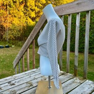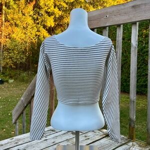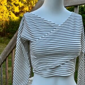 Walter Baker long sleeve front wrap crop top, size small. Black and white stripes. Stretchy fabric; 67% rayon, 28% nylon, 5% spandex